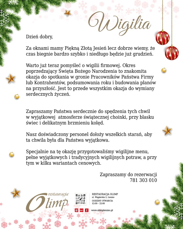 Jakość potraw, poziom obsługi i wystrój wnętrza stawiają restaurację Olimp w czołówce najlepszych lokali gastronomicznych w Lesznie.